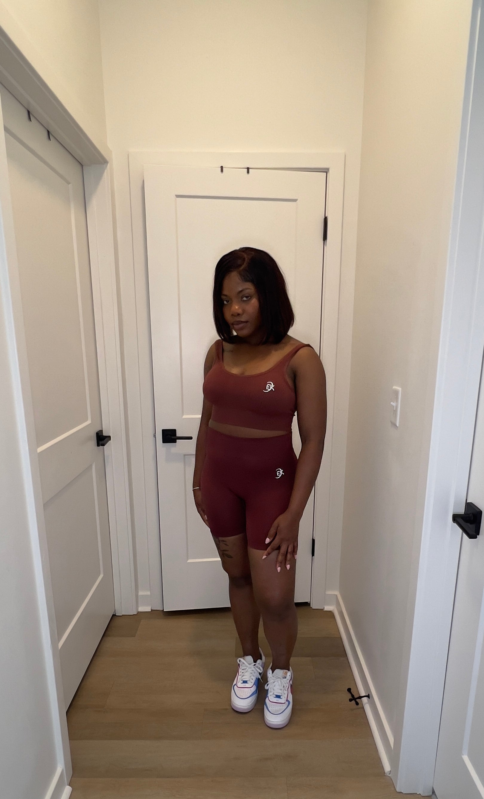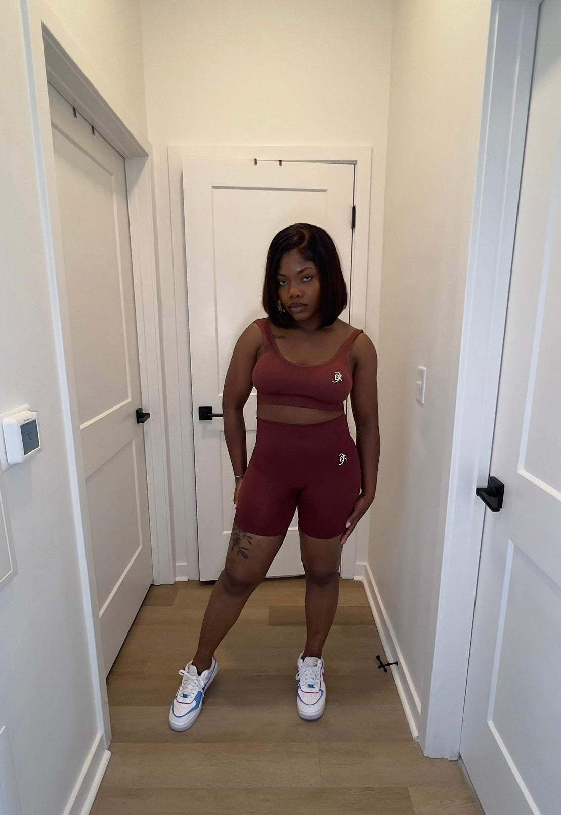 Bra Top – A scoop-neck, wide-strap design that fits snugly around the chest for support and comfort together with High-Waisted Shorts, Designed to contour the waist and hips.